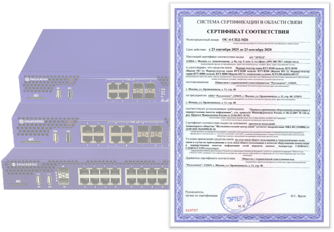 Мы сообщаем о успешном продлении сертификата соответствия для маршрутизаторов RTT серий R100, R200 и R800. Оборудование соответствует требованиям приказа Мининформсвязи России от 6 декабря 2007 г. N 144 " Об утверждении Правил применения оборудования коммутации и маршрутизации пакетов информации ", что подтверждается новым сертификатом соответствия ОС-4-СПД-3426.